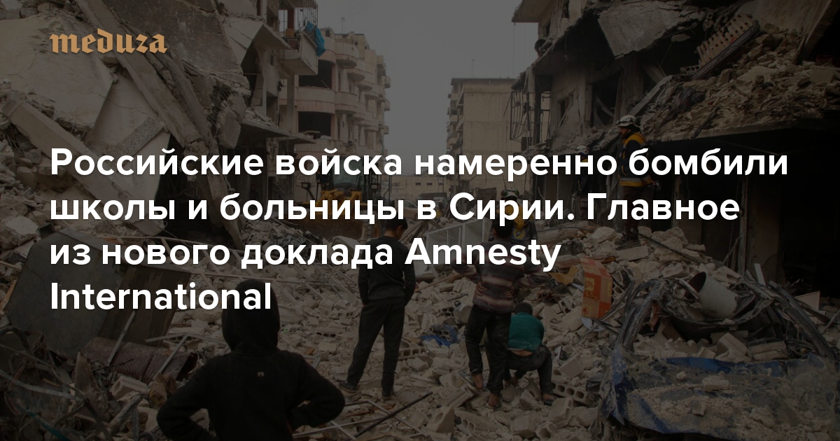 Российская авиация, а также самолеты правительства Сирии в последние месяцы регулярно наносили авиаудары по школам и больницам в провинциях Идлиб, Хама и Алеппо на северо-западе страны. Об этом говорится в докладе правозащитной организации Amnesty International (есть в распоряжении «Медузы»).