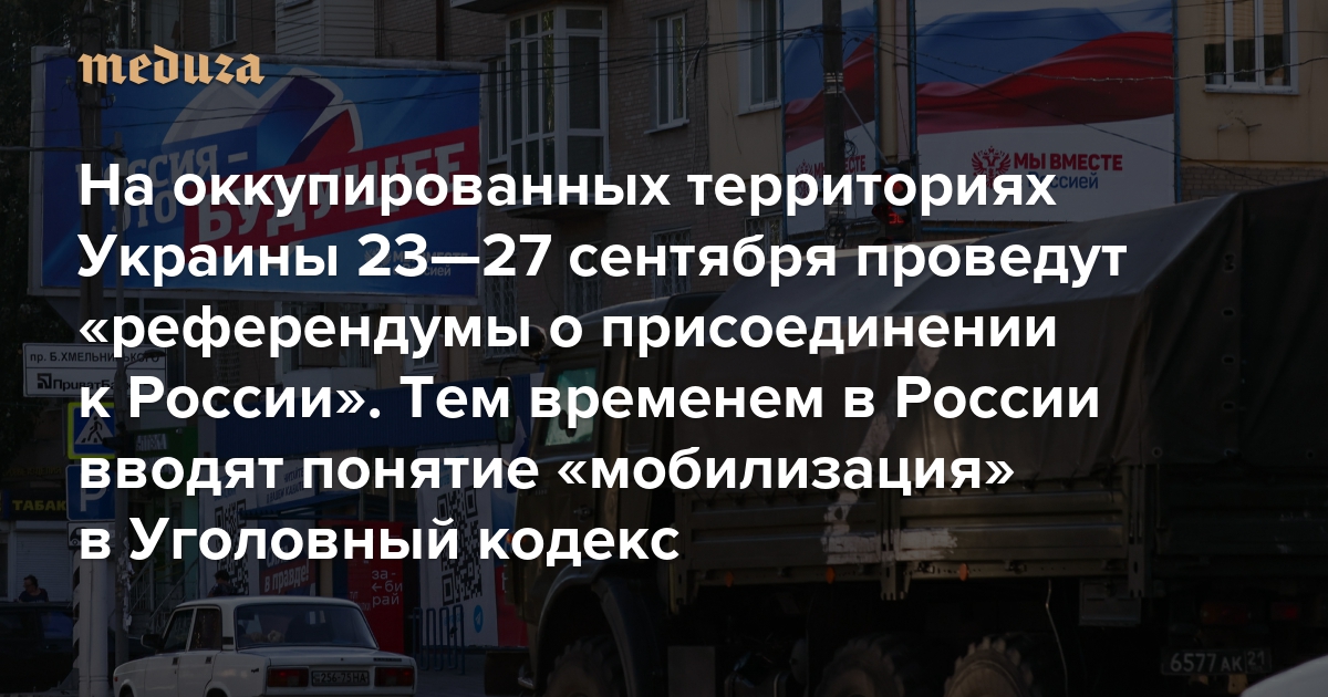 На оккупированных территориях Украины 23–27 сентября проведут «референдумы о присоединении к России». Главное Тем временем в России вводят понятие «мобилизация» в Уголовный кодекс