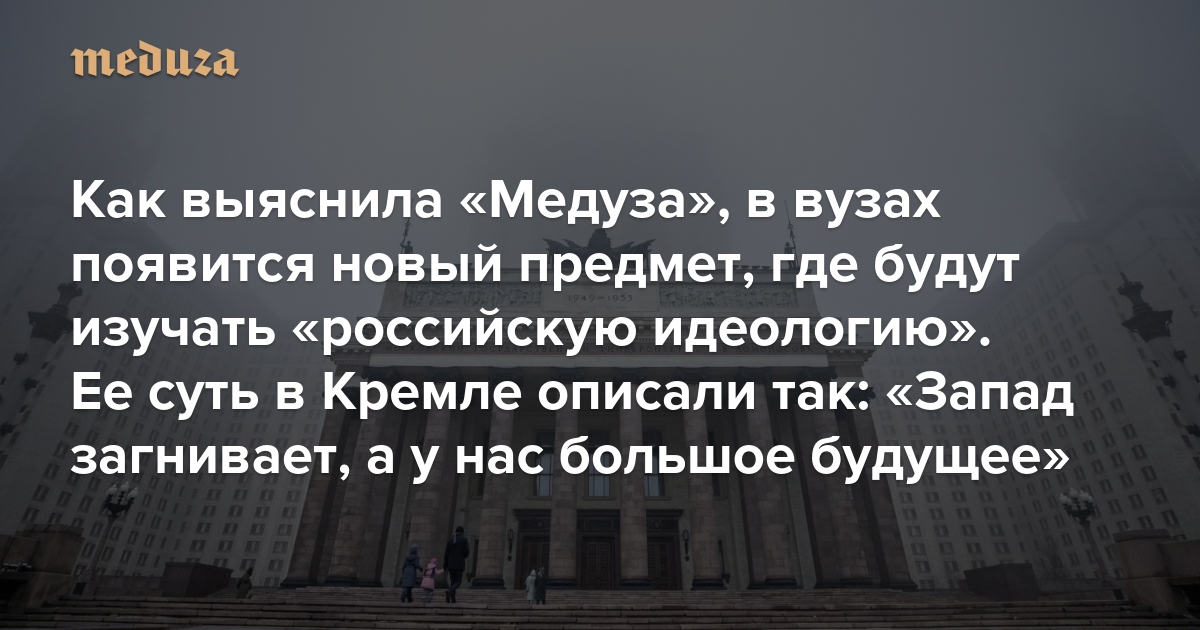 «Молодые должны понимать, куда идет Россия» Как выяснила «Медуза», в вузах появится новый предмет, где будут изучать «российскую идеологию». Ее суть в Кремле описали так: «Запад загнивает, а у нас большое будущее»