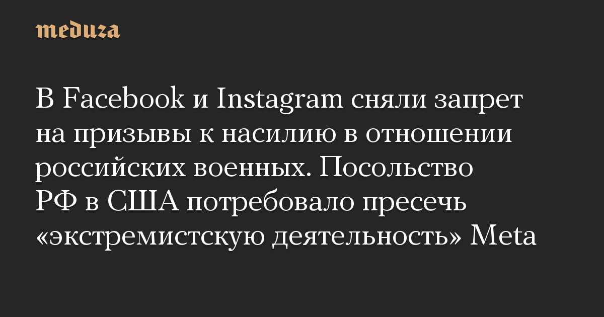 В Facebook и Instagram сняли запрет на призывы к насилию в отношении российских военных. Посольство РФ в США потребовало пресечь «экстремистскую деятельность» Meta
