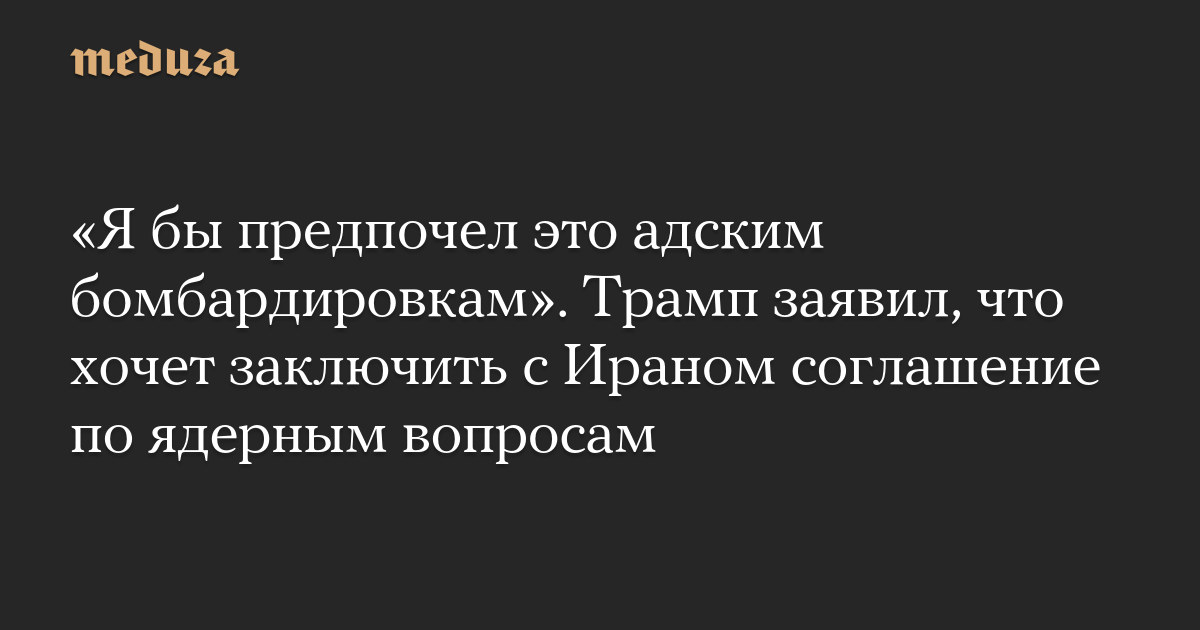 «Я бы хотел, чтобы с Ираном была заключено соглашение по ядерным вопросам. Я бы предпочел это адским бомбардировкам… Они не хотят умирать. Никто не хочет умирать. Если мы заключим соглашение, Израиль не будет их бомбить», — заявил Трамп.